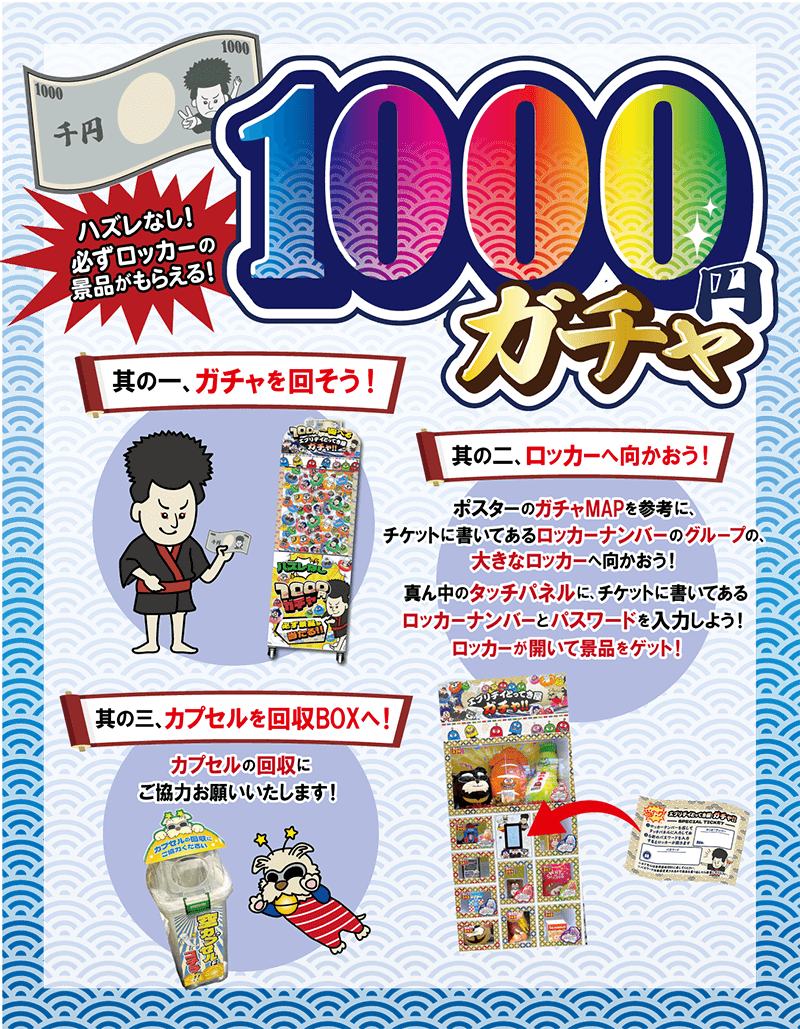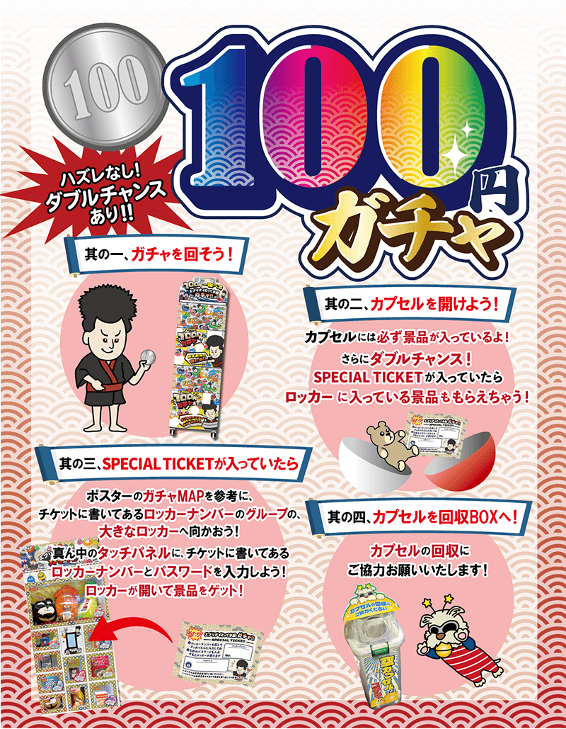 エブリデイとってき屋ガチャは100円からハズレなしで遊べます! 1,000円ガチャはディスプレイロッカーに入った景品が必ず当たる超お得でワクワク・ドキドキ楽しめます エブリデイとってき屋ガチャは「もってき屋」の隣に展開しています。