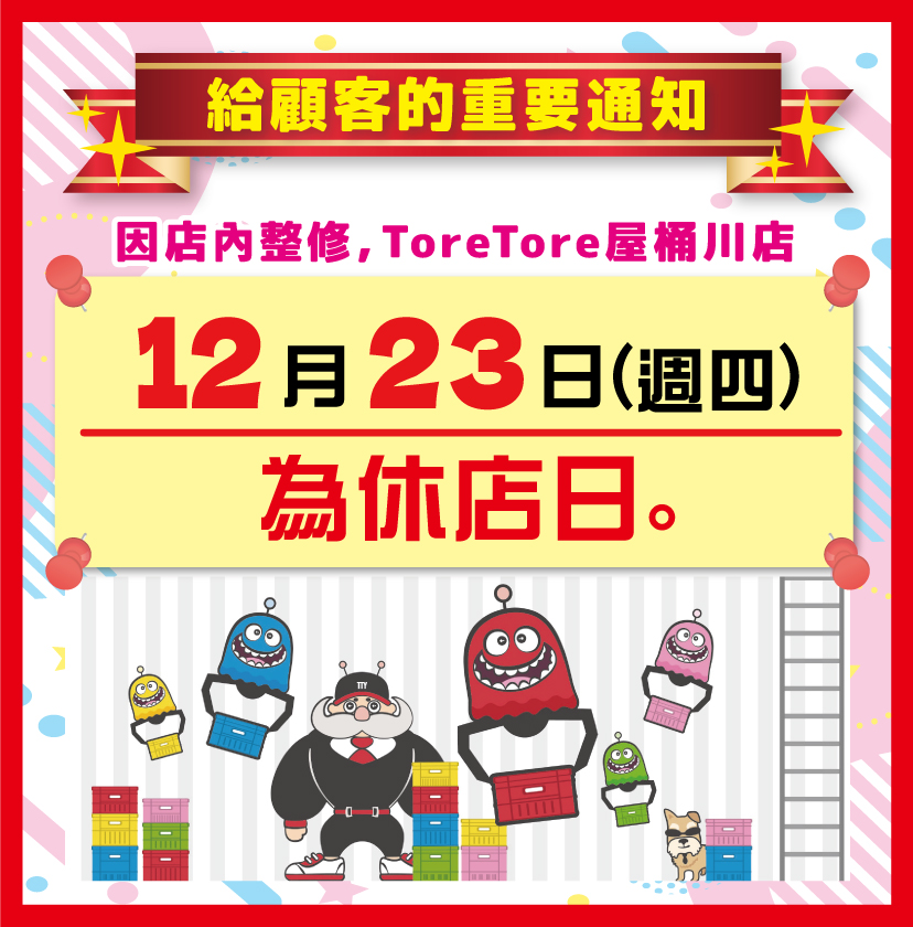由於店鋪整修,易樂得Everyday桶川店將於12月23日(週二)休業。
